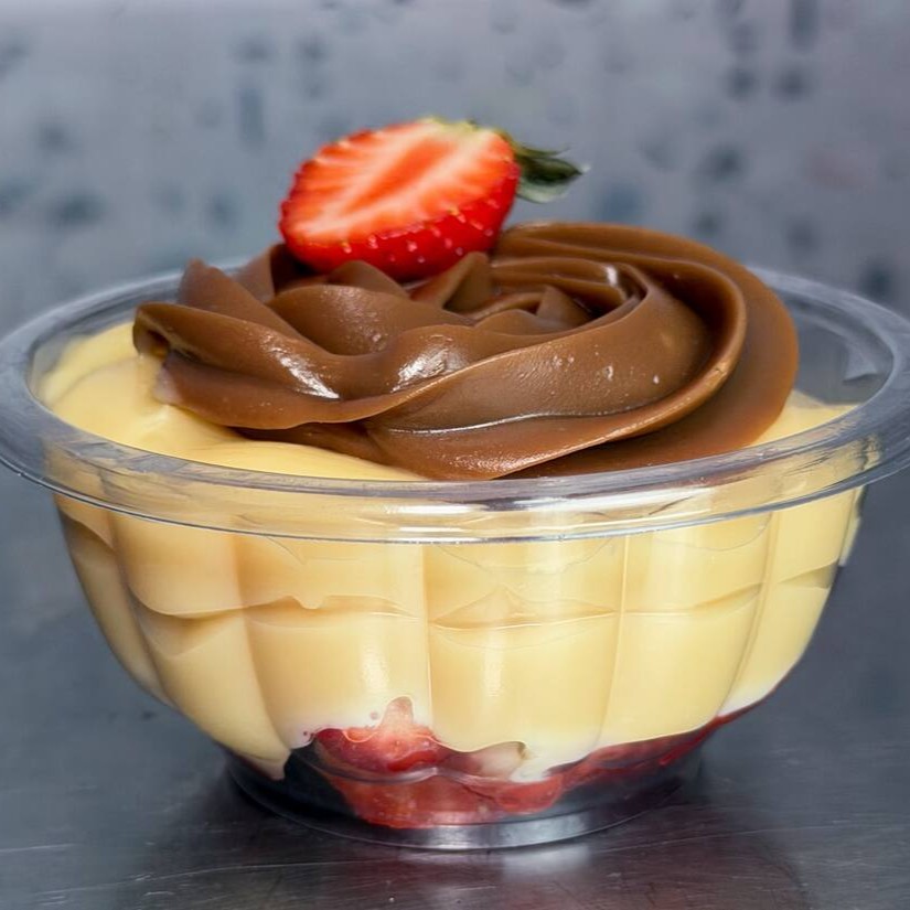 Uma combinação irresistível de morangos frescos e selecionados, envolvidos em um cremoso brigadeiro de chocolate branco, finalizada com uma generosa camada de brigadeiro de chocolate preto. Um doce equilibrado, fresco e extremamente saboroso, perfeito para quem ama chocolate e morango em perfeita harmonia.