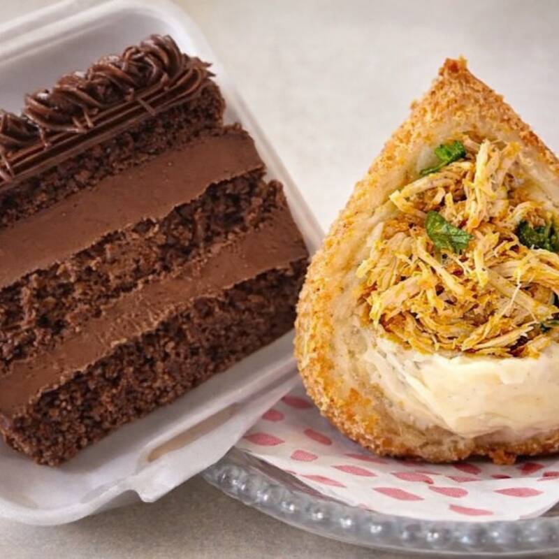 Nossa deliciosa coxinha acompanhada por uma fatia generosa de torta de brigadeiro!