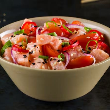 Salmão fresco marinado com temperos da casa, cebola roxa, tomate cereja e cebolinha, levemente picante.