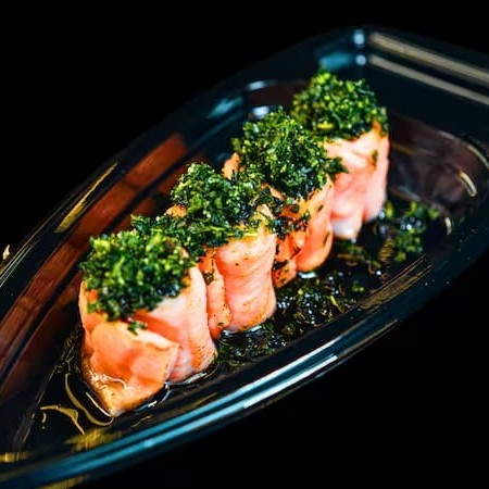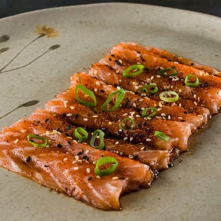 Desfrute de nosso Carpaccio de Salmão, um prato requintado que consiste em dez fatias delicadamente finas de salmão fresco, cuidadosamente regadas com nosso autêntico molho Ponzu caseiro. Para aprimorar ainda mais o sabor, o prato é salpicado com a exótica pimenta Togarashi japonesa, que confere um toque levemente picante. Completando a obra, ingredientes importados primorosamente selecionados e uma base de shoyo de qualidade superior. Um prato que é uma verdadeira celebração dos sabores do Oriente.
