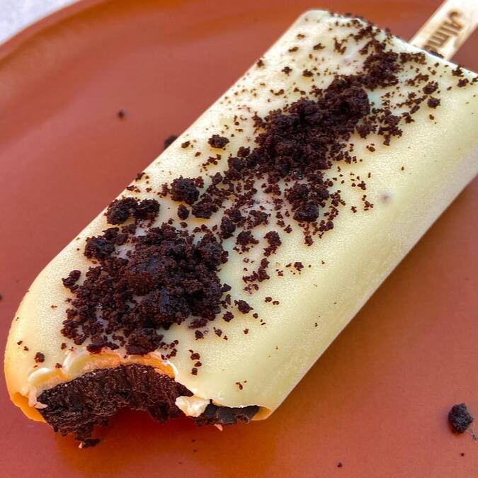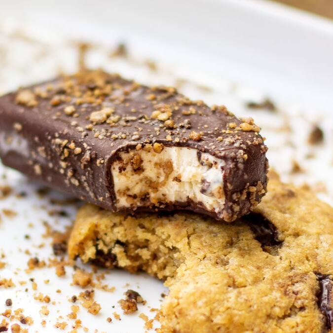 Picolé vegano de cookies coberto com capinha crocante de chocolate 63% e pedacinhos de cookies
