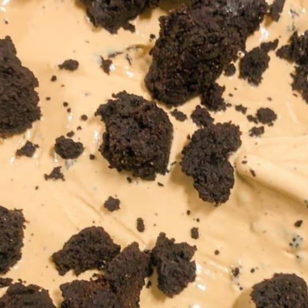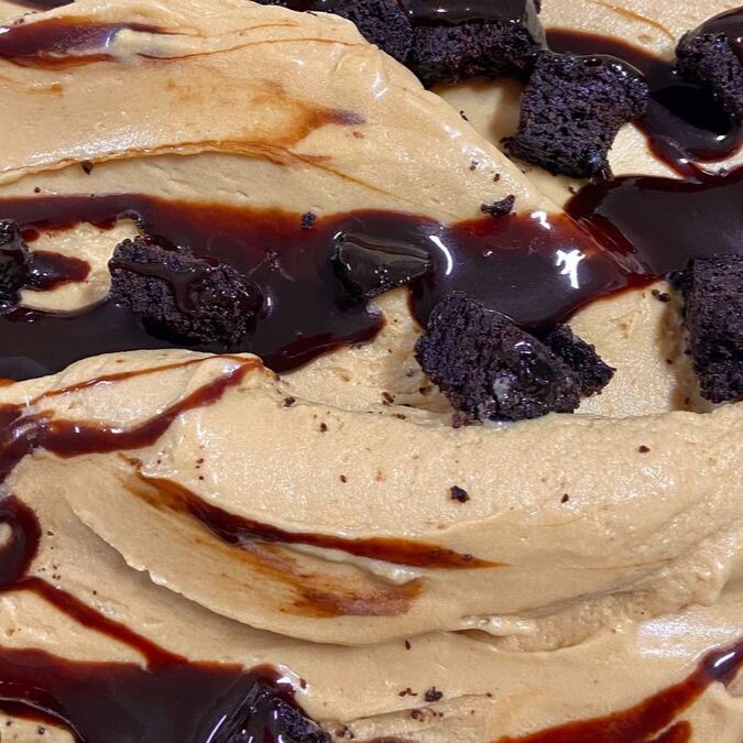 Sorvete de amendoim e caramelo com pedaços de cookies de chocolate e calda de chocolate. Pedaçudo e cremoso!