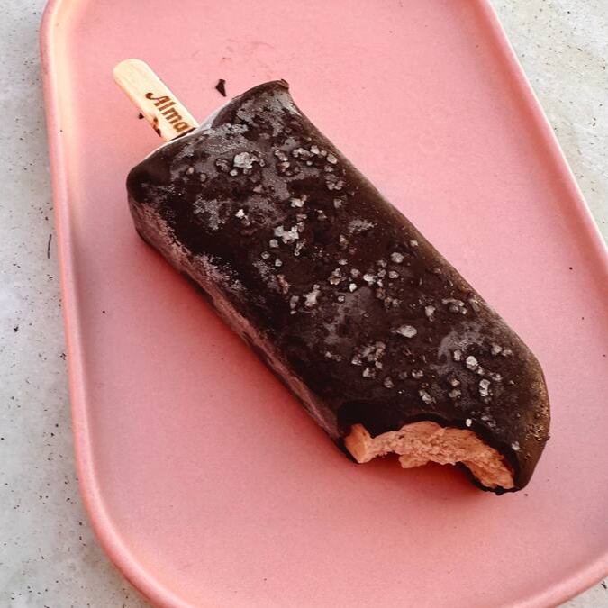 Picolé de amendoim vegano e sem açúcar, coberto por chocolate sem açúcar 75% e finalizado com flor de sal