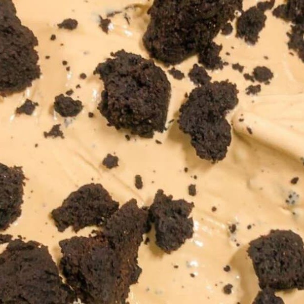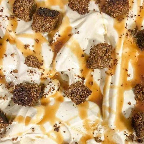 Sorvete de caramelo com toque de flor de sal com pedaços de e farofinha de brownie da casa (sem farinha de trigo)