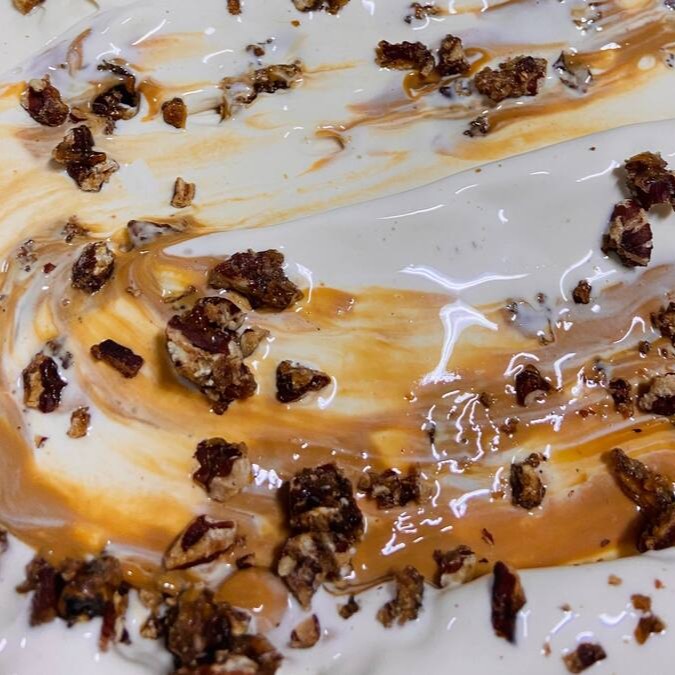 Sorvete de caramelo com toque de flor de sal. Caramelo queimado cuidadosamente fazendo de cada leva única!