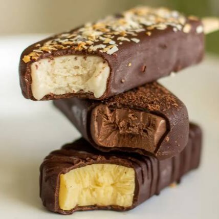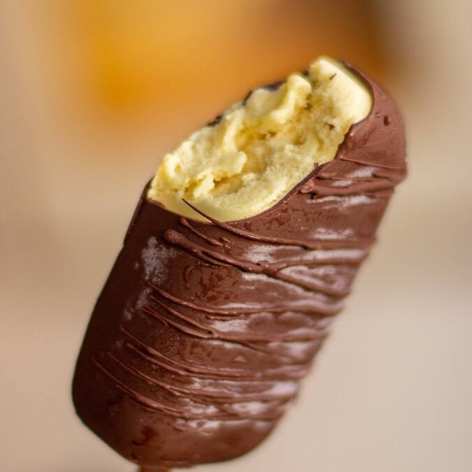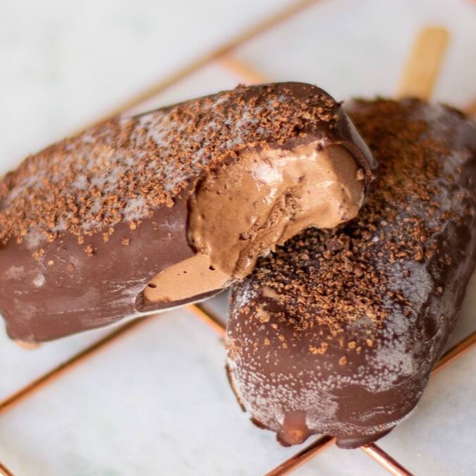 Picolé de sorvete de chocolate com avelã coberto com capinha crocante de chocolate 63%