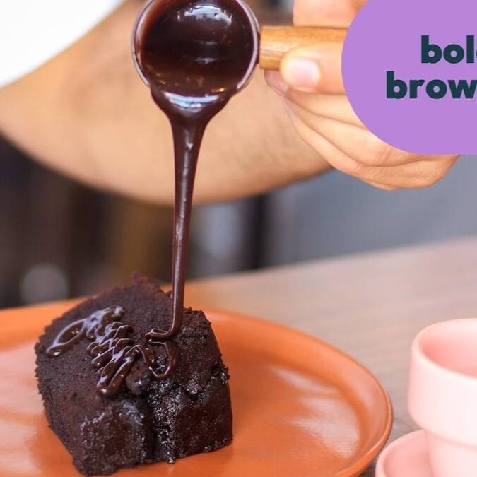 Nossa versão de bolo caseirinho beeem chocolatudo. Feito na nossa cozinha, é vegano e sem glúten (feito com farinha de arroz). Acompanhado de calda à sua escolha: chocolate ou caramelo (tradicional ou vegana).