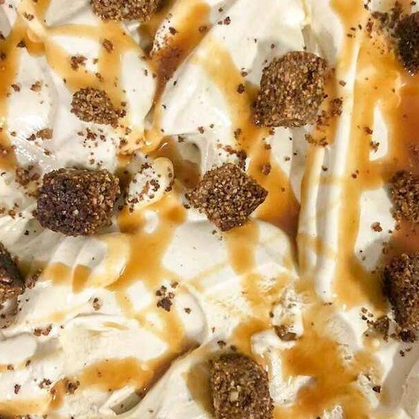 Sorvete de banana, pedaços de crumble de castanhas e calda de caramelo