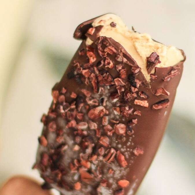 Picolé vegano de sorvete de caramelo salgado coberto com capinha crocante de chocolate 63% e nibs de cacau