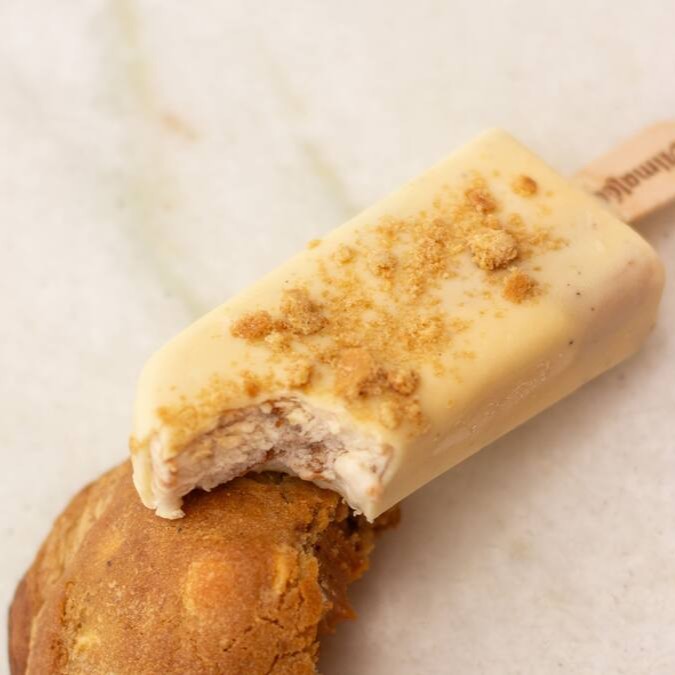 A collab mais biscoituda do ano chegou! Picolé em parceria com a Moma Cookie Lab! Sorvete de gingerbread, biscoito gingerbread da moma e caramelo salgado. Tudo isso coberto por capinha de chocolate branco e farorinha de biscoito :)