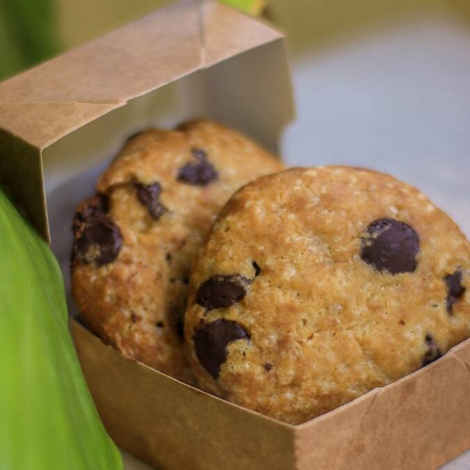 Caixinha com 02 cookies tradicionais, veganos e feitos com farinha de arroz, com gotas de chocolate 63%