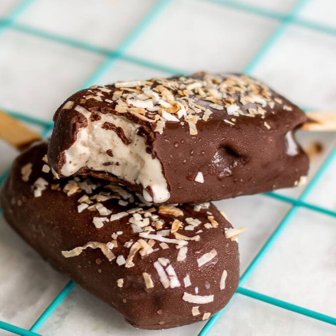 Picolé sem açúcar de coco queiamdo coberto com capinha crocante de chocolate 50% e flocos de coco