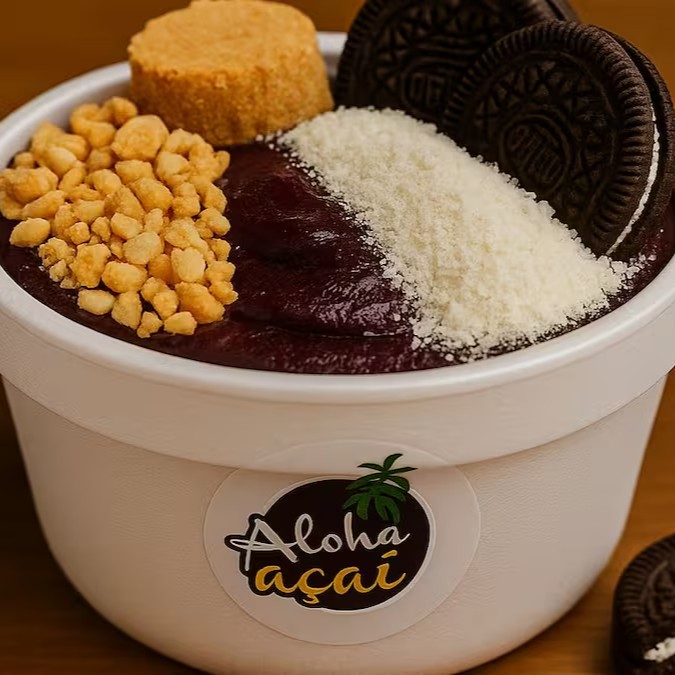 Açai, amendoim de alta qualidade, paçoca, Oreo , leite em pó e calda de morango.