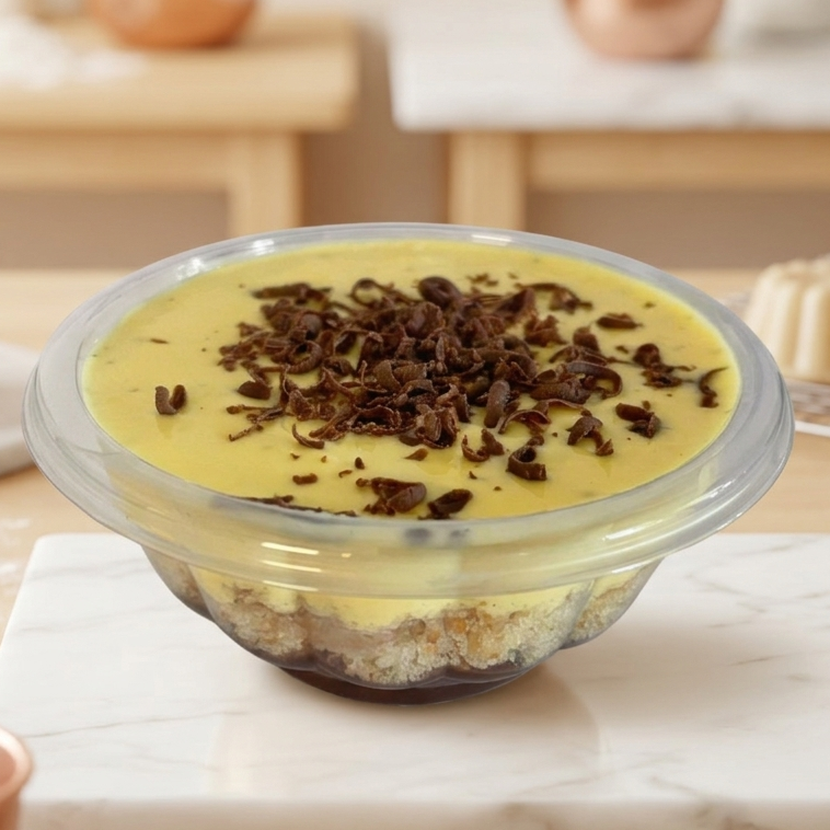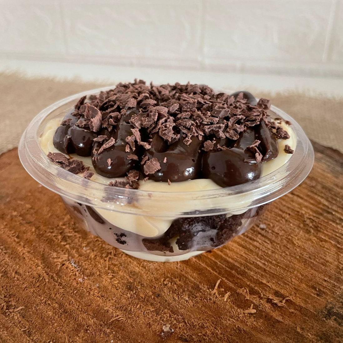 Brigadeiro de chocolate, bolo de baunilha, mousse de maracujá e raspas de chocolate para decorar. Pote de 150ml