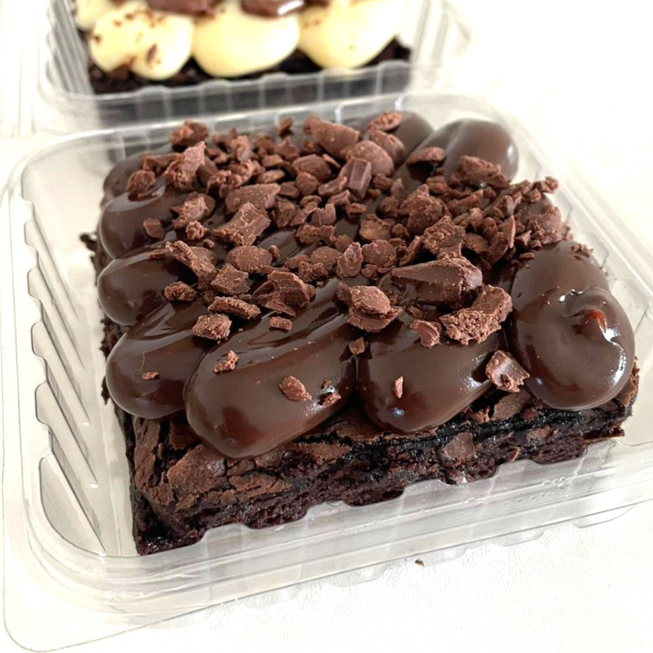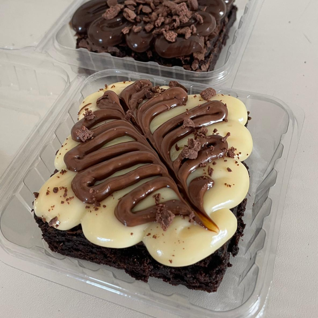 Pedaços de brownie, 1 camada de brigadeiro 4 leites e uma camada de chocolate por cima. Brownie para decorar