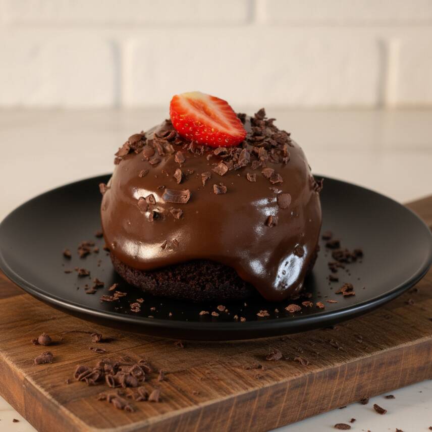 Bolo de chocolate macio e bem chocolatudo, coberto com brigadeiro cremoso de chocolate, com pedaços de morango fresco. Decorado com morango fresco e pedacinhos de chocolate