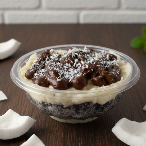 Esse pote é composto por, duas camada de brigadeiro de coco, uma camada de bolo de chocolate e chocolate para finalizar.
