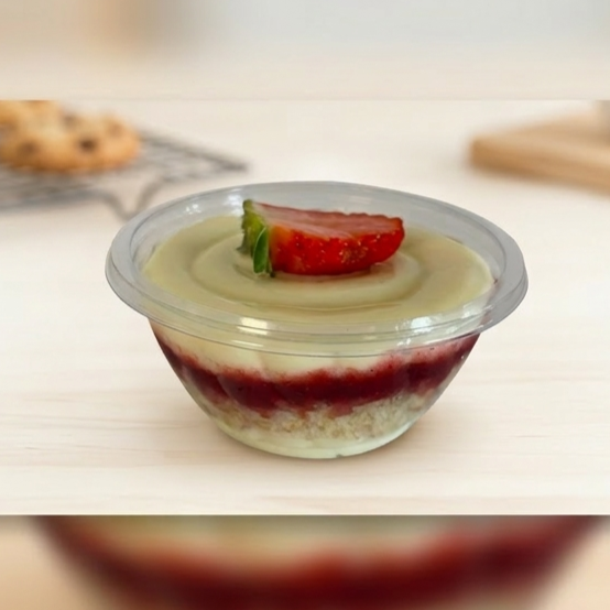 brigadeiro cremoso de ninho, geleia de morango artesanal, bolo de baunilha ( morango fresco para decorar) Pote de 150ml