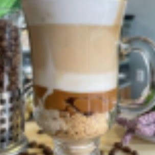 Café em camadas feito com doce de leite, leite vaporizado, café expresso e paçoca.