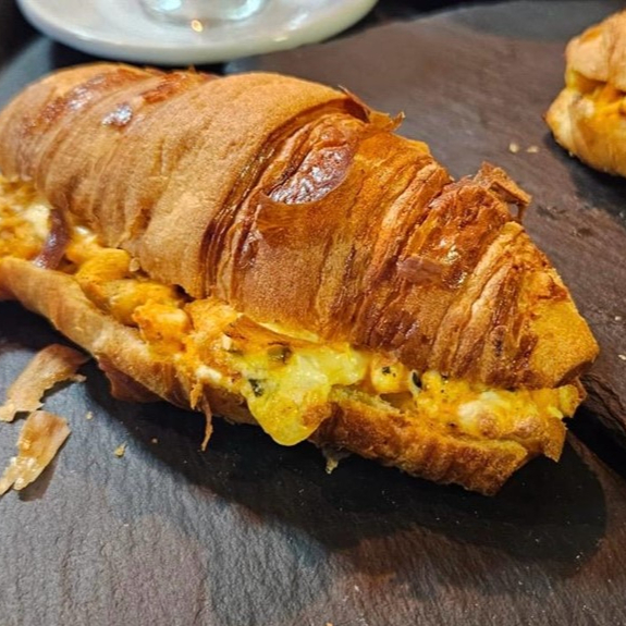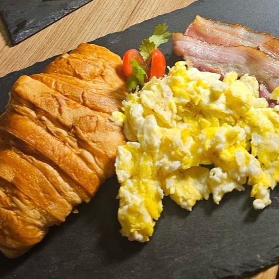 CROISSANT MASSA FOLHADA AMATEIGADA, OVOS E BACON FATIADO FRITOS
