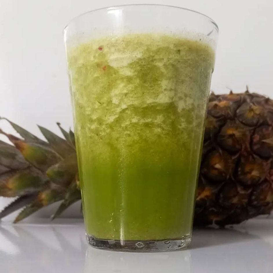 SUCO DETOX COM ABACAXI, MAÇÃ, COUVE, GENGIBRE, LIMÃO, HORTELÃ E LINHACA DOURADA