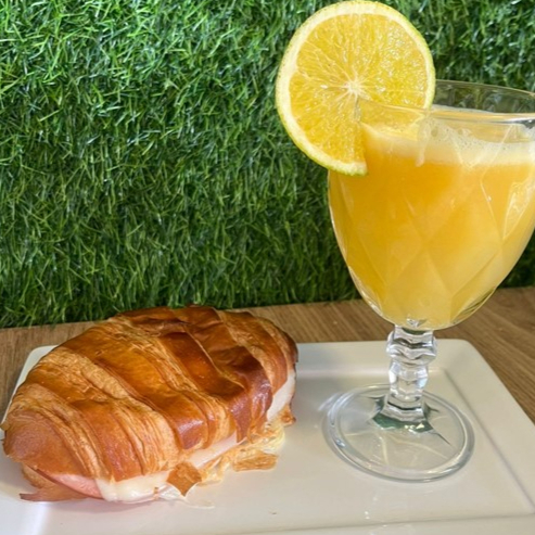 Combo, um croissant com peito de peru e queijo e suco de laranja