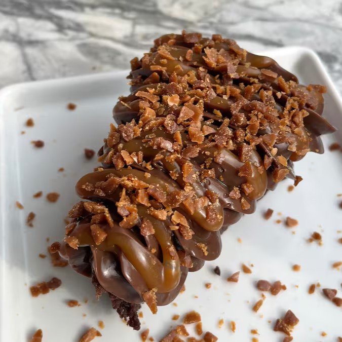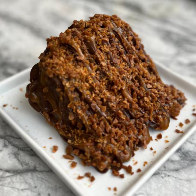 Deliciosa fatia de chocolate, coberta com nosso exclusivo brigadeiro super cremoso de chocolate, caramelo salgado cremoso e crocante de caramelo. Uma verdadeira explosão de sabores.