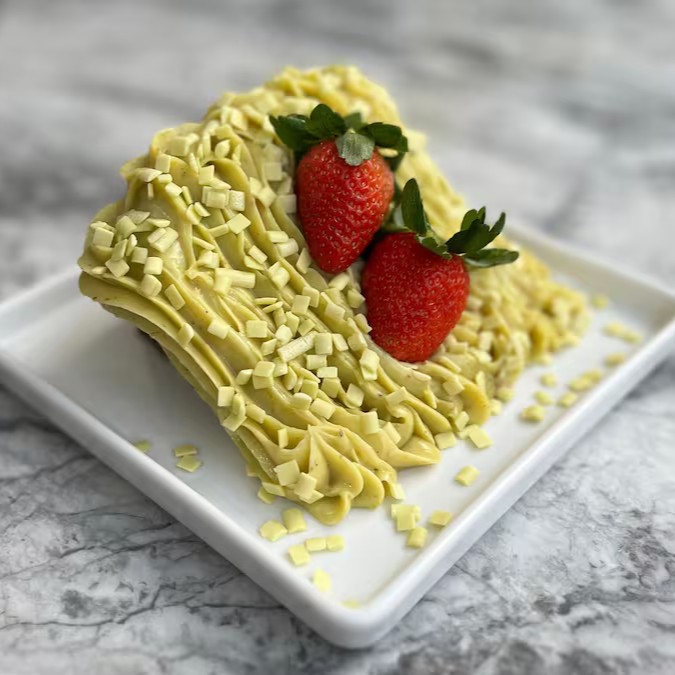 Fatia deliciosa com massa amanteigada tradicional, coberta com geleia artesanal de morango, brigadeiro cremoso de pistache, granulado sabor pistache e morangos premium in natura.