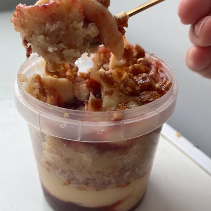 Delicioso pote com bolo amanteigado tradicional, recheio de brigadeiro branco cremoso, geleia artesanal de morango e crocante de amendoim
