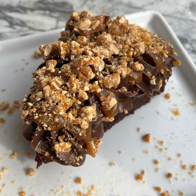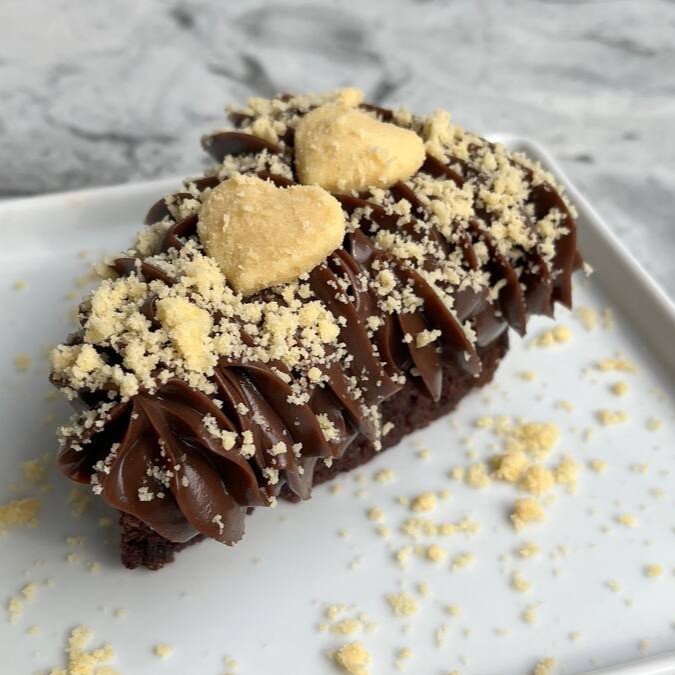Deliciosa fatia de chocolate, coberta com nosso exclusivo brigadeiro super cremoso de chocolate, caramelo e crocante de amendoim. Uma verdadeira explosão de sabores.