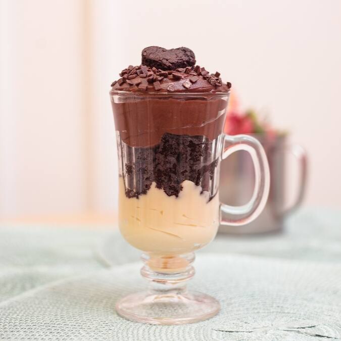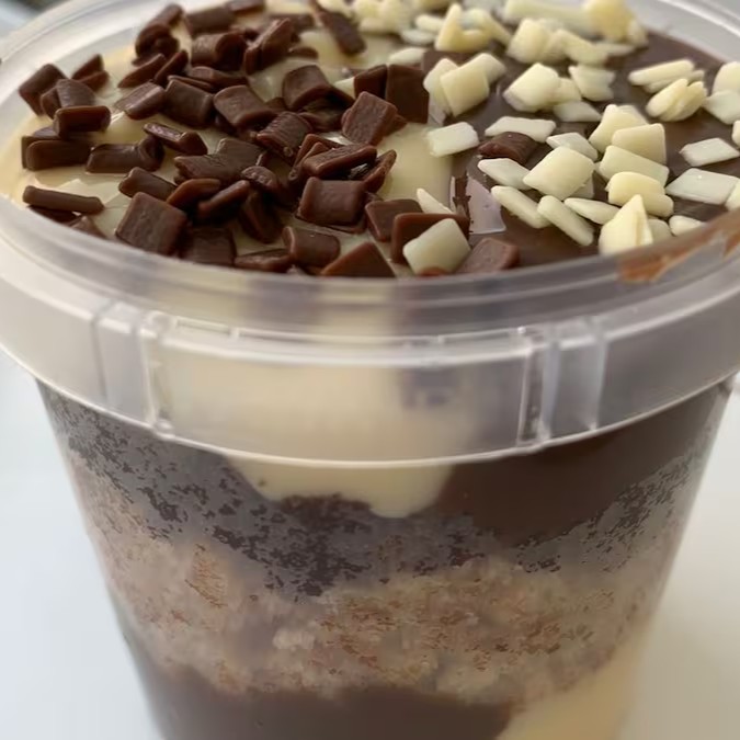 Versão no copo do nosso bombom aberto de búlgara, com creme de brigadeiro branco, torta búlgara e creme de brigadeiro preto. Copo de 250ml.