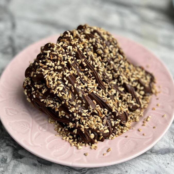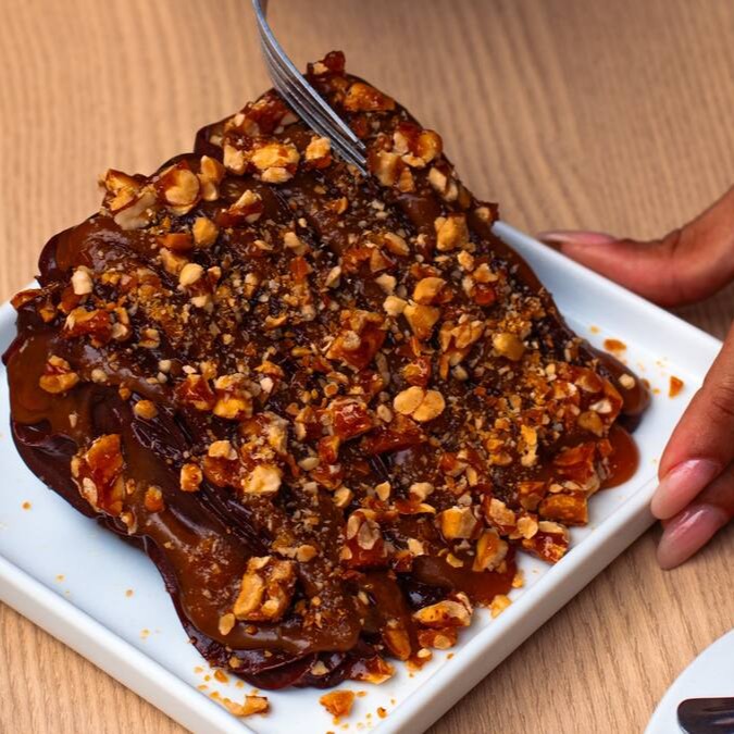 Deliciosa fatia de chocolate, coberta com nosso exclusivo brigadeiro super cremoso de chocolate, Nutella e xerém de castanhas.