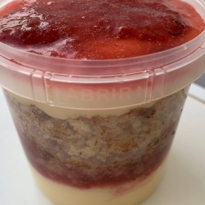 Pote recheado com bolo branco, geleia artesanal de morango e creme de brigadeiro branco. Aproximadamente 220g.