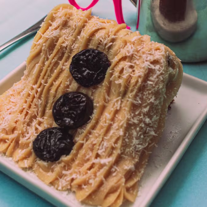 Clássica fatia branca, coberta com geleia de ameixa, brigadeiro branco super cremoso, coco ralado e ameixas.