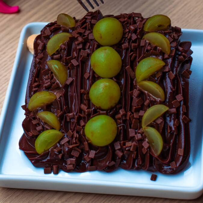 Fatia deliciosa de chocolate, coberta com nosso exclusivo brigadeiro super cremoso, finalizada com granulado e uvas.