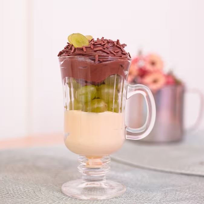 Versão no copo do nosso bombom aberto de uva, com creme de brigadeiro branco, uvas selecionadas e creme de brigadeiro preto. Copo de 250ml.