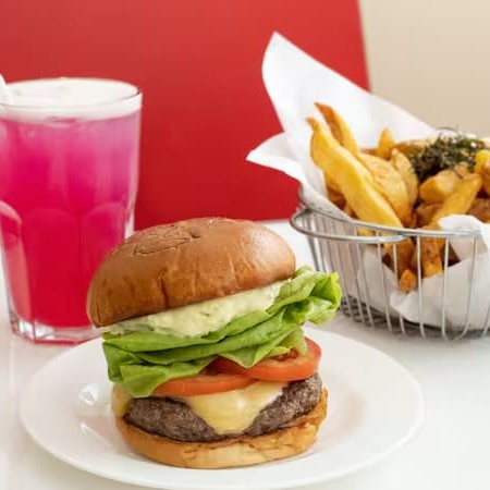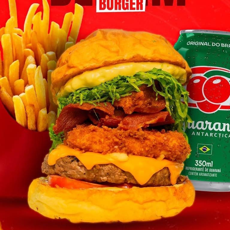 Berlim Burger: Pão de batata, Hambúrguer 120g, Cheddar em Fatias, Catupiry Empanado, Bacon, Alface e Tomate, e Molho Aquilas + Acompanhamento de Batata + Refrigerante.