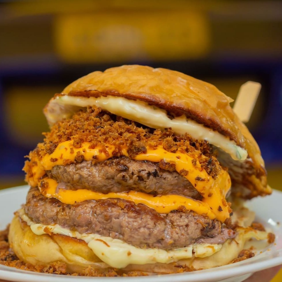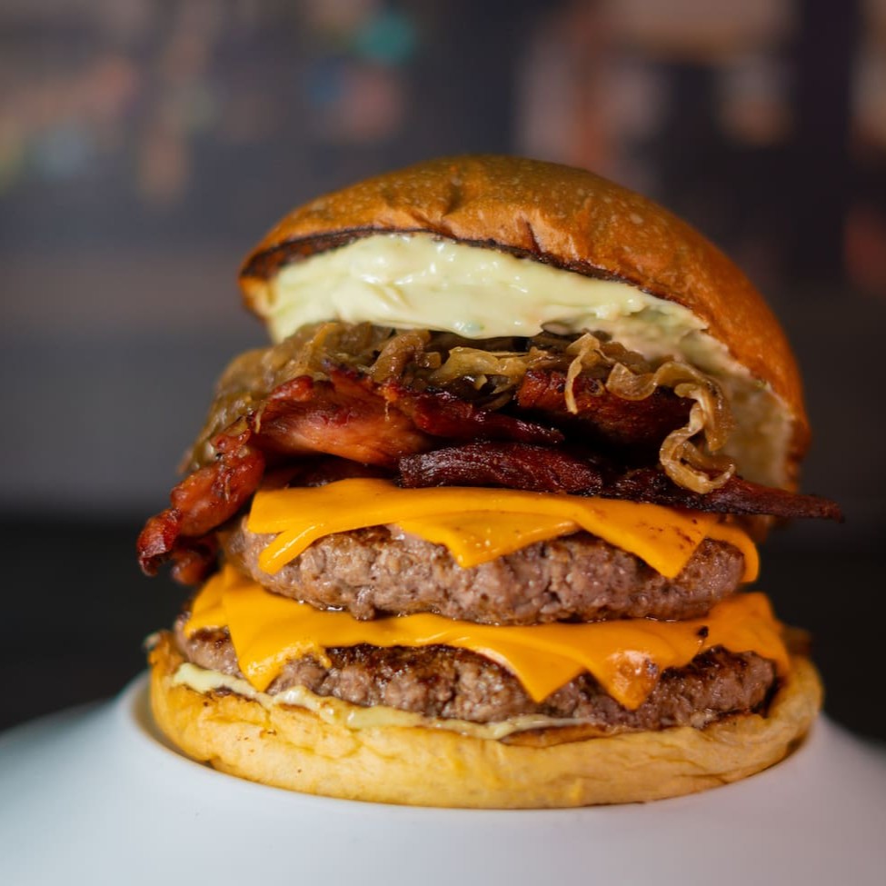 (Pão de batata amanteigado e chapeado, duas carnes de hambúrgueres 120gr, creme de cheddar, farofa de bacon e molho Aquilas)