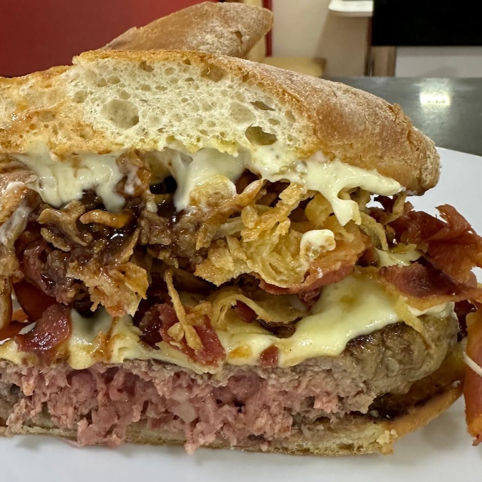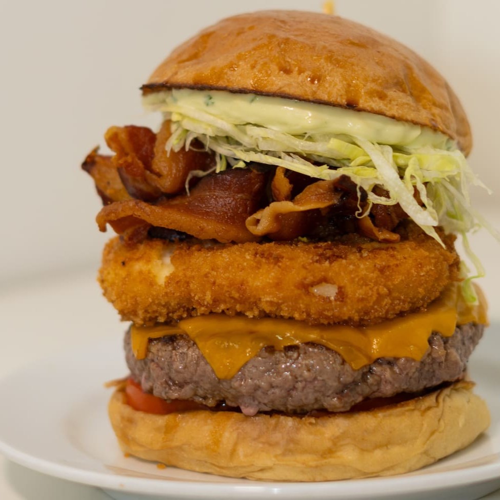 (Pão ciabatta, hamburguer 240gr, queijo mussarela, bacon, crispy onion, barbecue e creme de queijo)