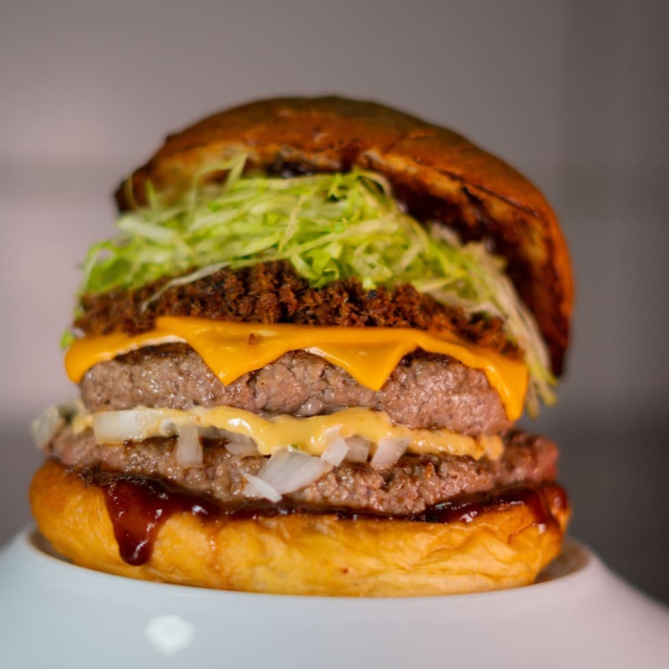 (Pão de batata, dois hambúrgueres de 120gr, cheddar em fatias, farofa de bacon, cebola picada, alface americana, molho rose e barbecue)