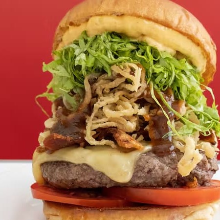 (Pão de batata amanteigado e chapeado, hambúrguer 120gr, bacon, crispy onion, alface, tomate, molho de queijos e barbecue)