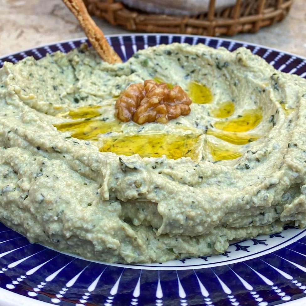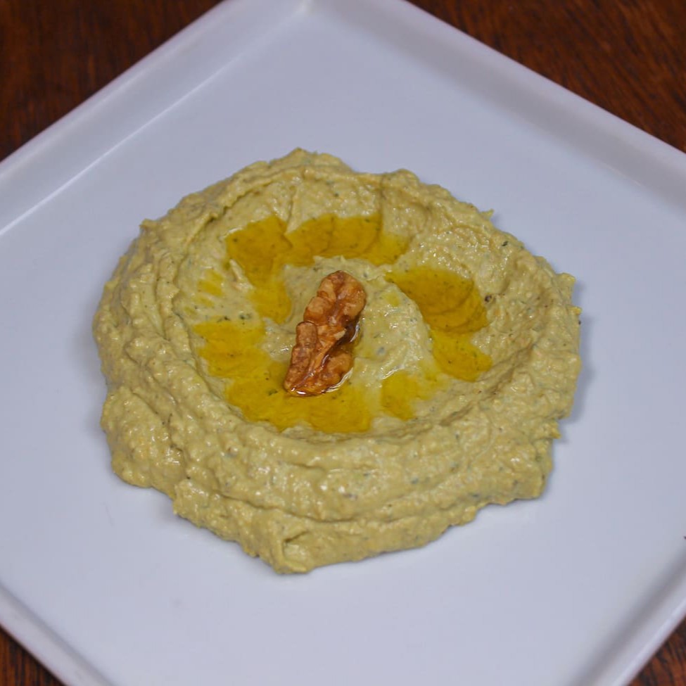 Nossa releitura da tradicional receita de Hommus, o Hommus Rayhan leva nozes e manjericão. Acompanha porção de pão sírio.