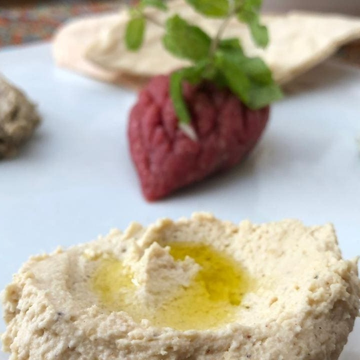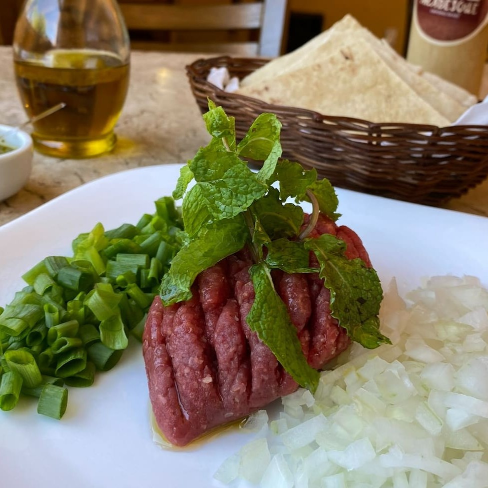 Tradicional kibe cru servido com cebola, hortelã e cebolinha. Acompanha pães sírios