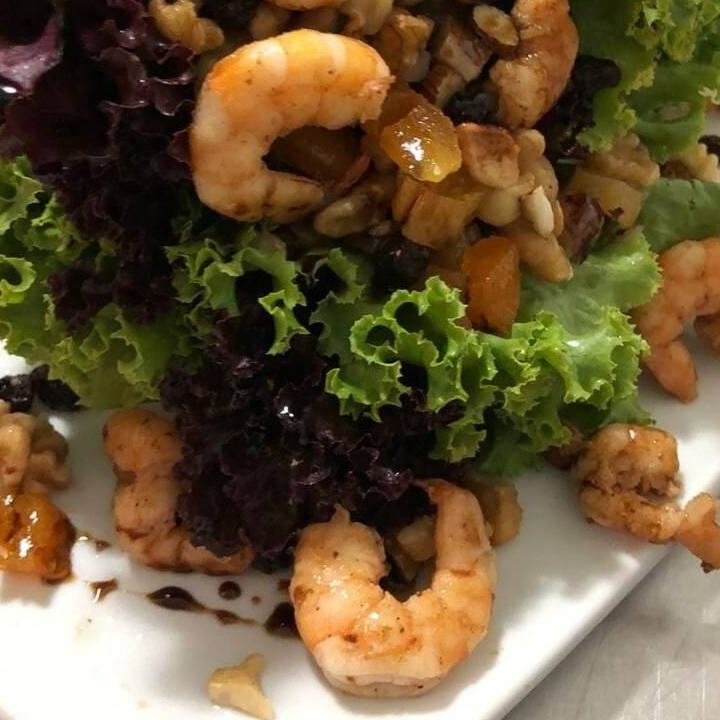 Mix de folhas com frutas desidratadas, camarões salteados no alho e molho de romã