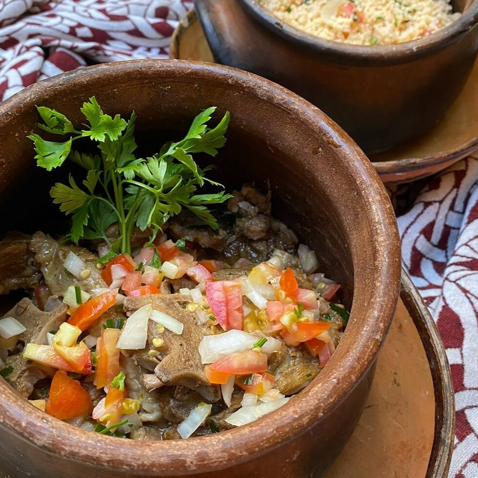 Ensopadinho de cordeiro com osso, acompanhado de cuscuz marroquino. Serve até duas pessoas