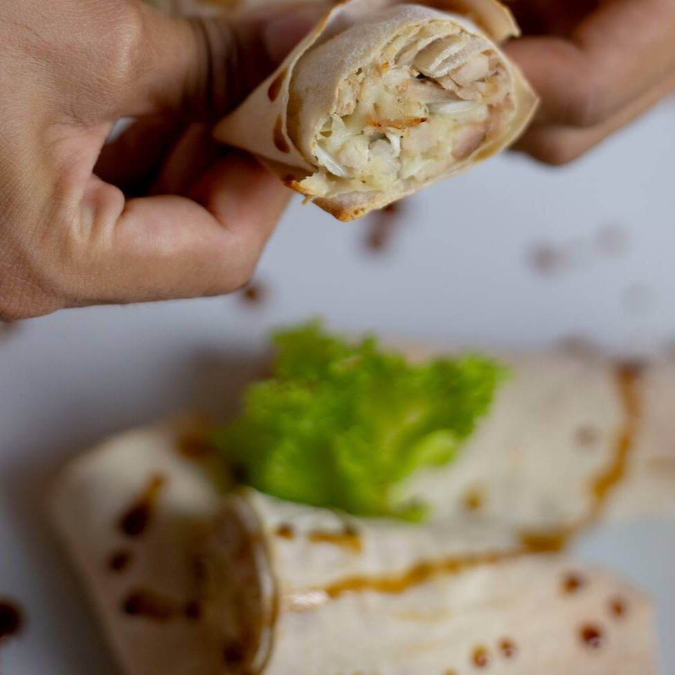 Pão sírio com pasta de alho, frango desfiado, passas, azeitona e cebola
