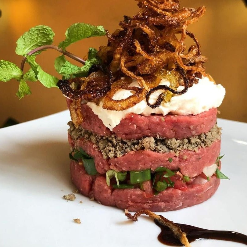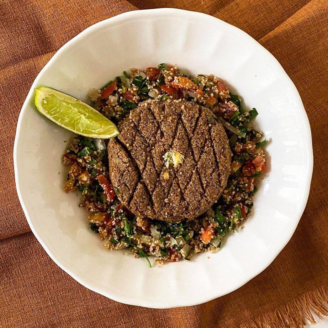 Nossa releitura do kibe cru, montado em camadas com salada tabule, carne moída, coalhada e cebola frita
