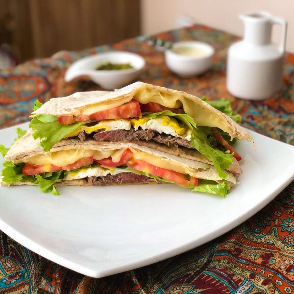 Pão sírio, filé mignon, queijo muçarela, ovo frito, alface e tomate. Serve até duas pessoas