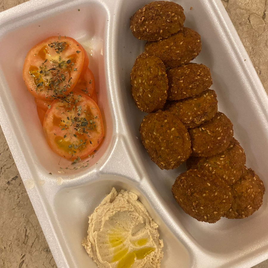 Bolinho de grão de bico frito, servido com com hommus e temperado com zaatar.