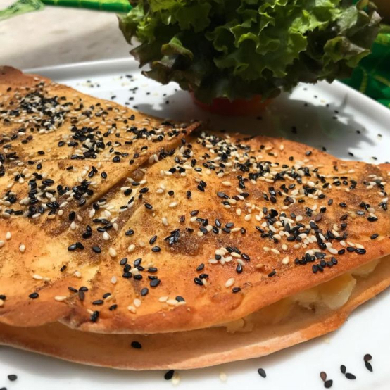 Pão sírio, mix de queijo- chanchish e mussarela com toque de gergelim